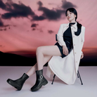 存在感のあるビジューバックルが目を引く、クールで上品な厚底ブーツ。