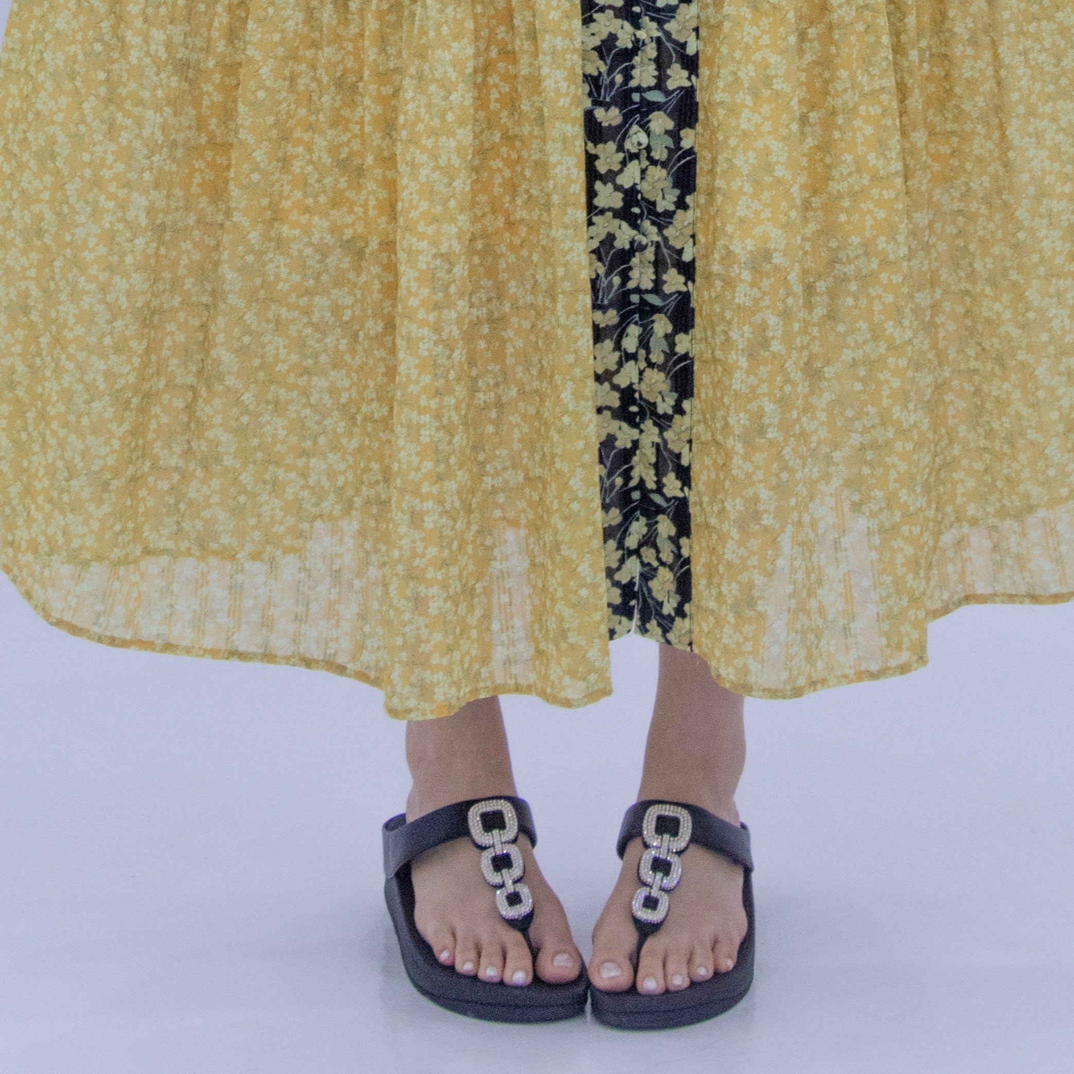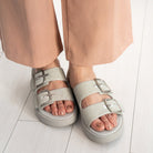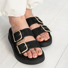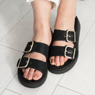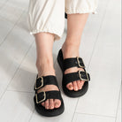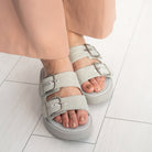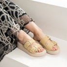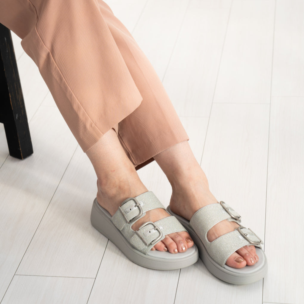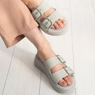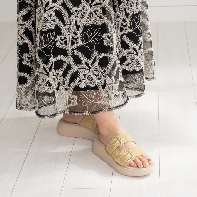 存在感のあるバックルデザインが目を引く、モダンな厚底サンダル