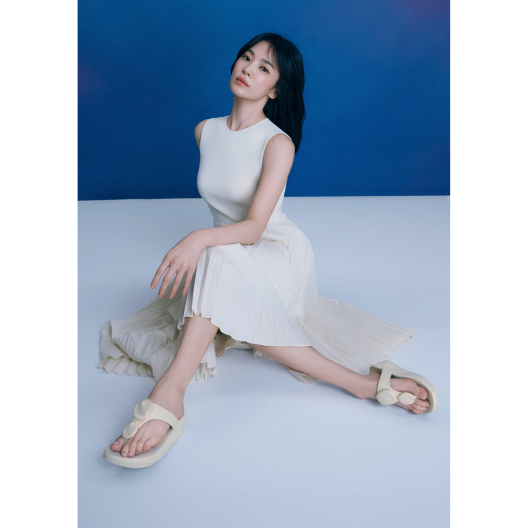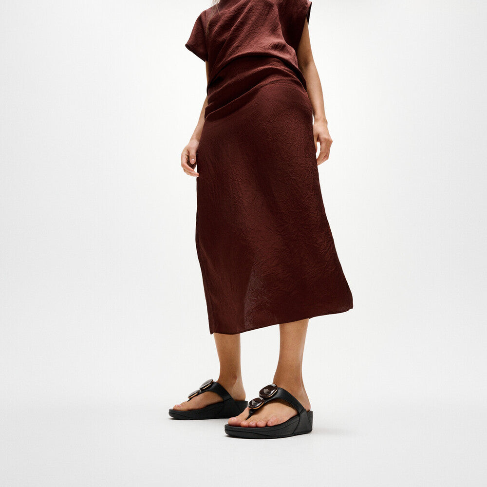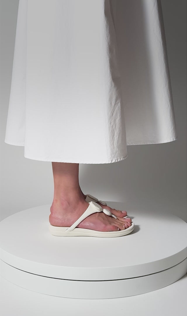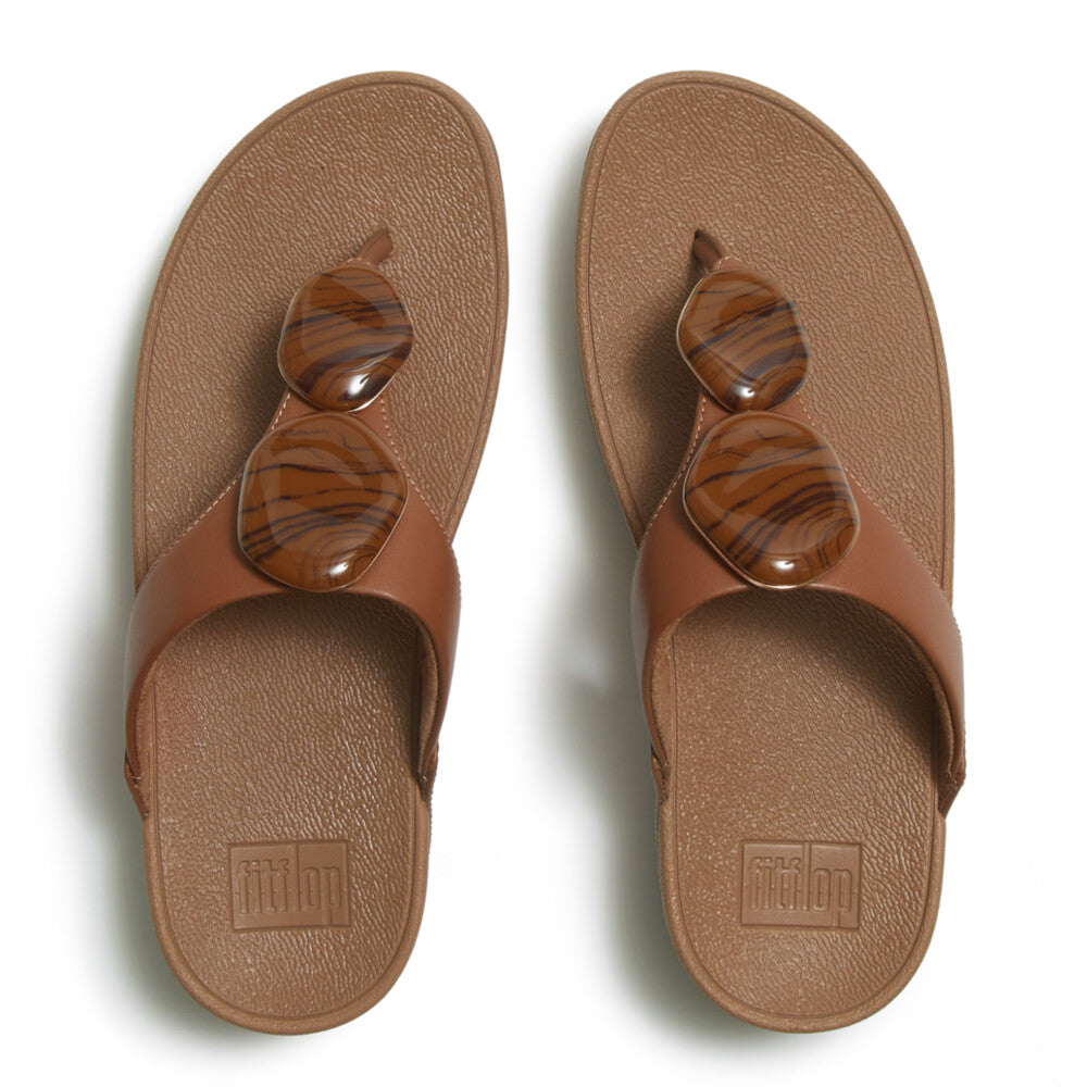トゥポストサンダルは、三角形の甲革に光沢のある大理石調のストーンをあしらい、シルクのように柔らかなパッド入りレザーを使用しています。