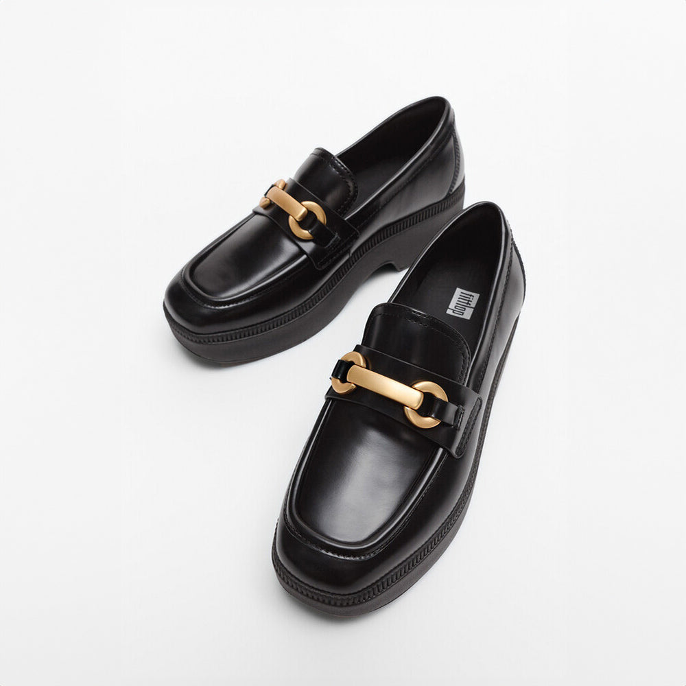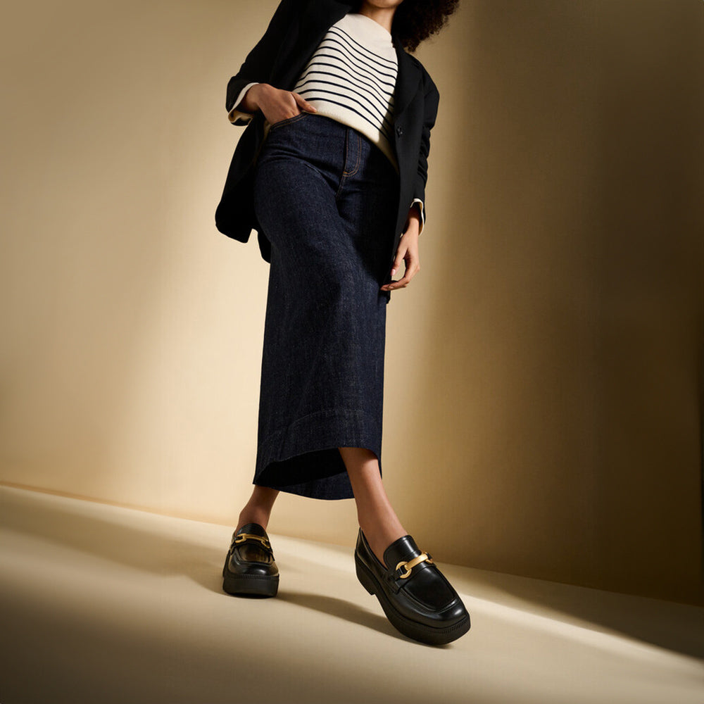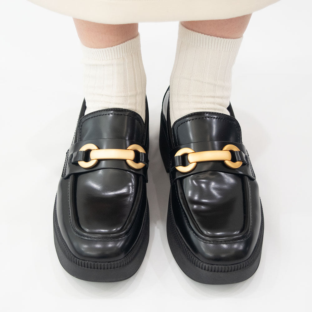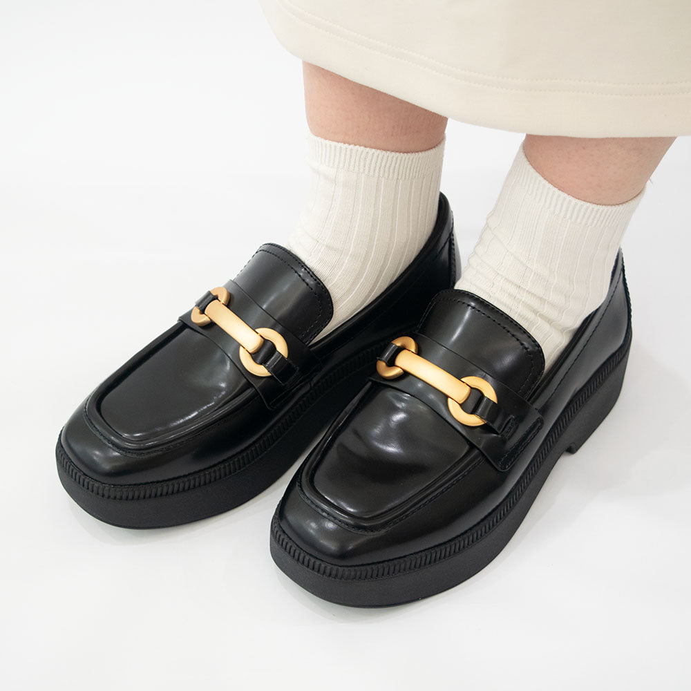 クラシカルなローファーに、ゴールドのビットデザインをプラス。シックなブラックカラーと厚底ソールが、洗練された印象を演出します。