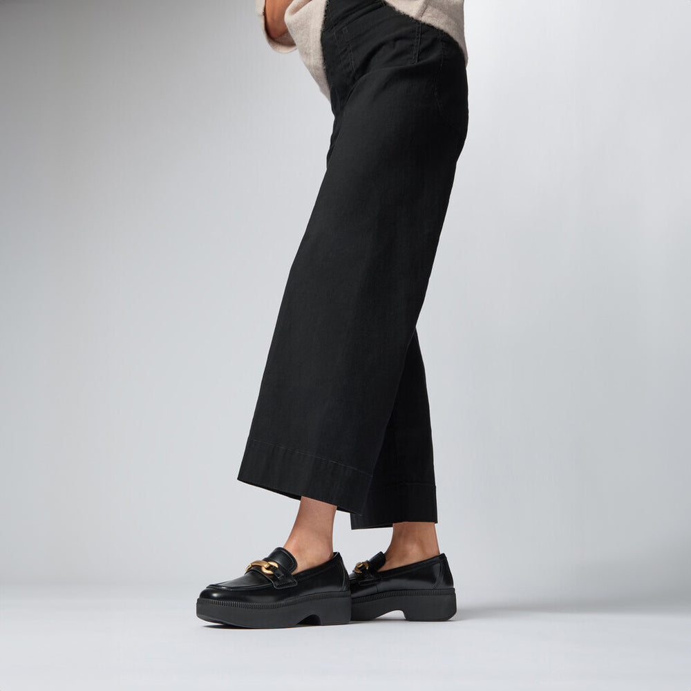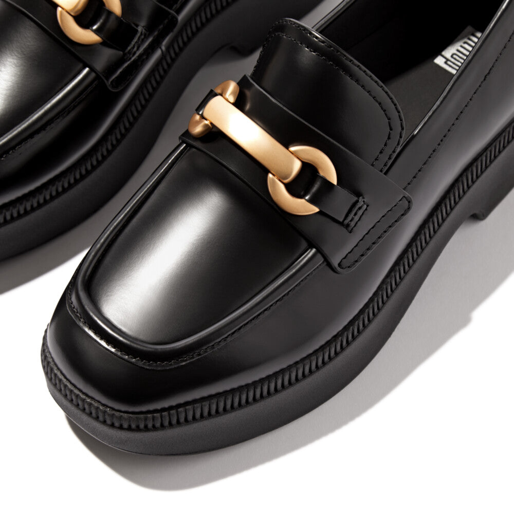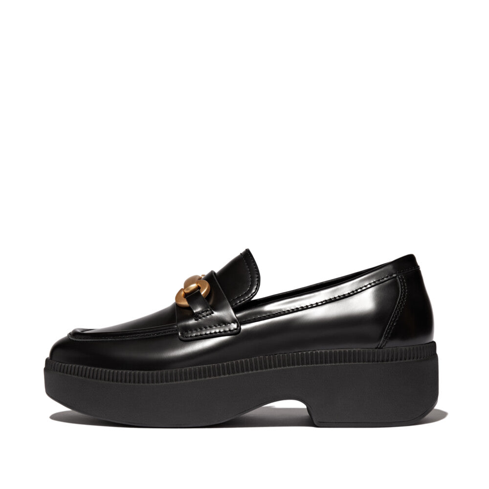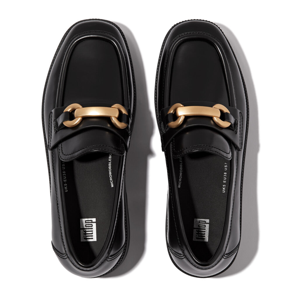 クラシカルなローファーに、ゴールドのビットデザインをプラス。シックなブラックカラーと厚底ソールが、洗練された印象を演出します。