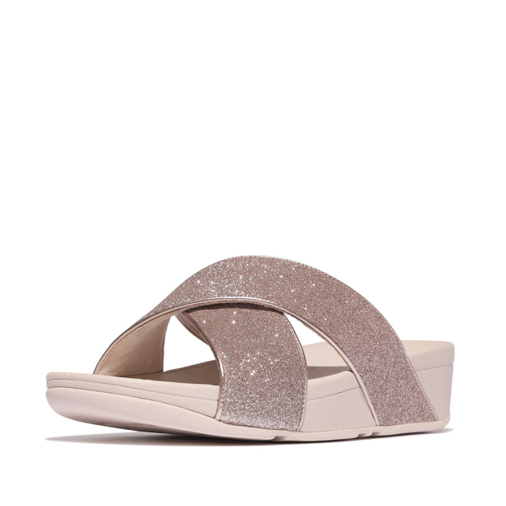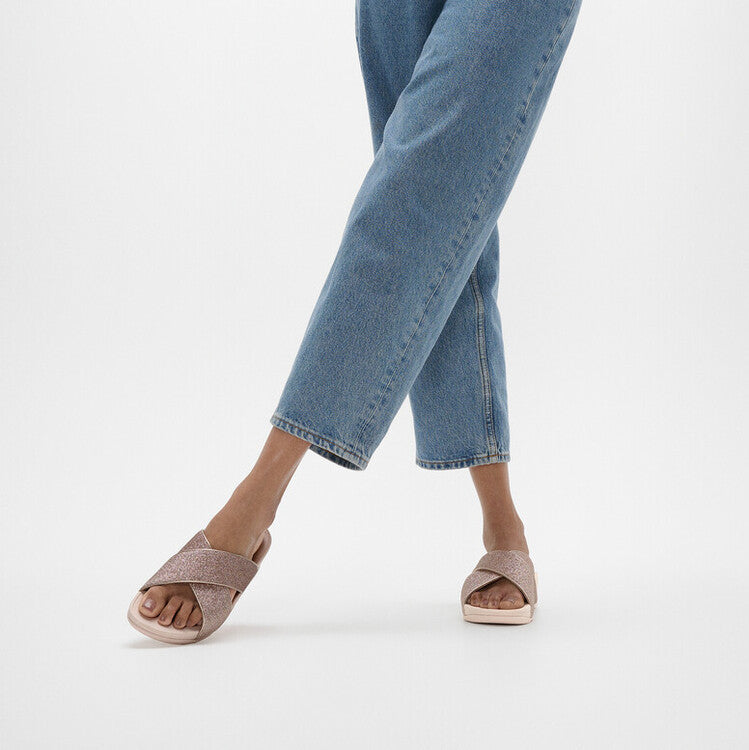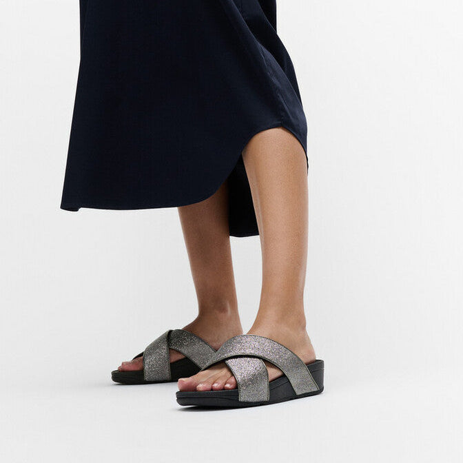 きらびやかな極細グリッターを贅沢に散りばめ、メタリックフェイクレザーの同系色パイピングが上品な印象を演出します。